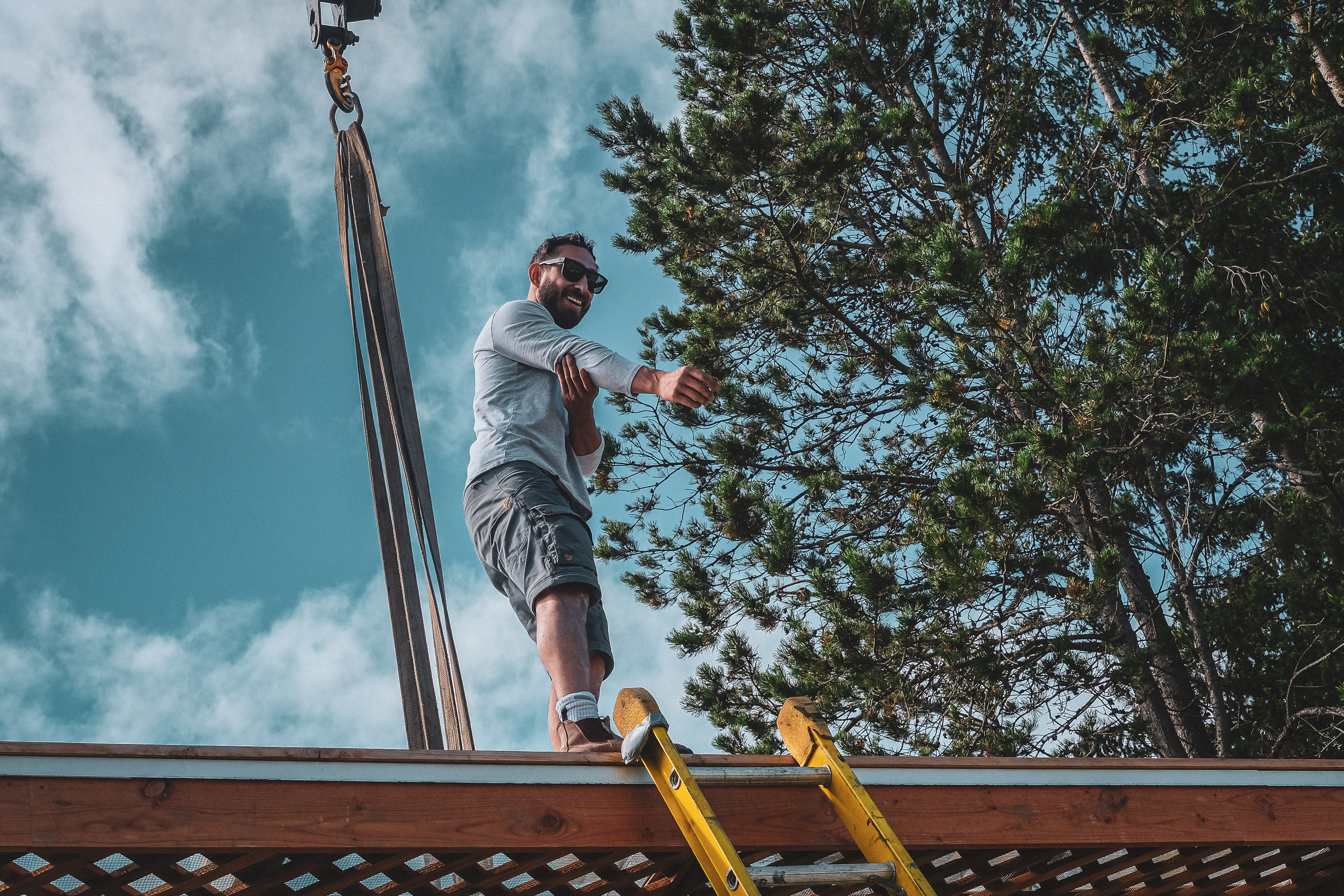 Before I knew it, the big day had arrived. Our whole crew rendezvoused with Luke and Ian in the morning for the biggest spectacle our company had yet be involved in (admittedly not the last). We strapped the entire structure up meticulously and repeatedly, being of course sure to slap the roof multiple times for the time-honoured tradition of predicting “that isn’t going anywhere” (a treasured Canadian invocation for good luck whenever straps are involved). The Beast sputtered and roared as it outstretched its mighty arm to grab a hold of the structure from the crown, whilst Luke raised his camera to capture every detail. Finally, we had lift off, and the great journey across Victoria began.